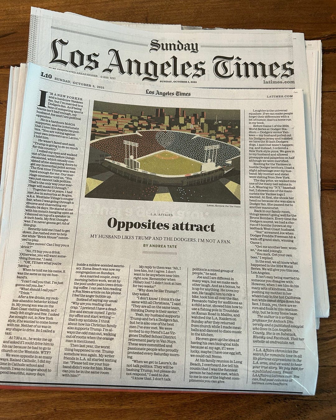 This week I’ll share my own published essay, in L.A. Times because it came out in hard copy on Sunday which is always rewarding to see and feel! Plus, it’s about baseball and other competitive teams.