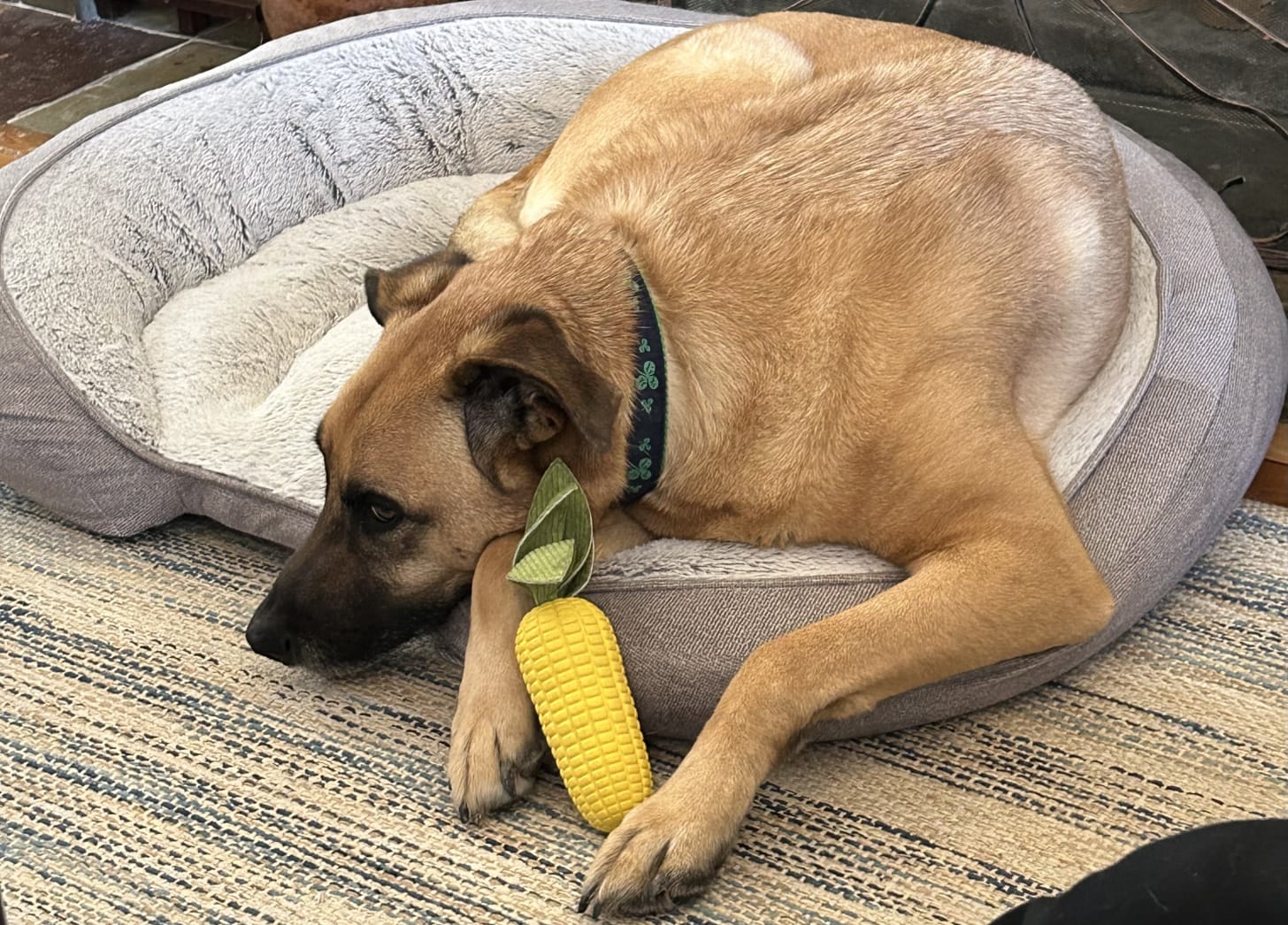Brody procrastinating ripping his toy corn-on-the cob apart. He’s definitely thinking about it though.